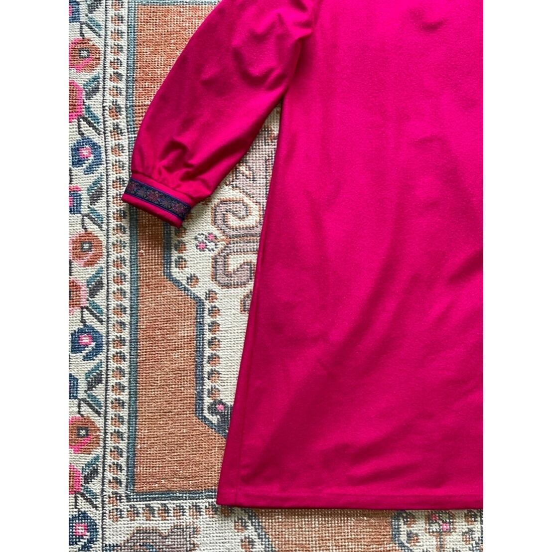 ローズピンクのフェルト素材(ポリエステル)に、胸元と袖口にお花のゴブラン織りがアクセント❤️